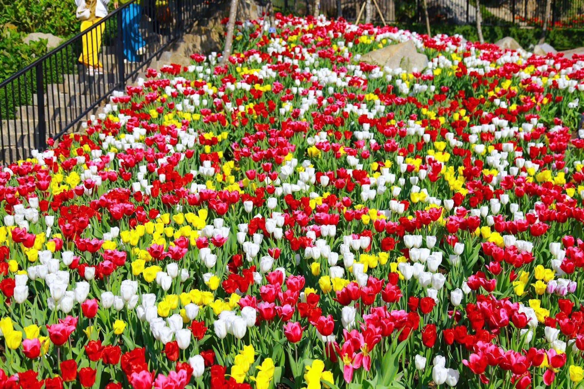 Khu vườn hoa tulip trung tâm là điểm nổi bật nhất, nơi hoa được trồng thành từng mảng lớn với nhiều gam màu khác nhau. Bên cạnh đó là các lối đi hoa và tiểu cảnh trang trí mang phong cách châu Âu, tạo background rất đẹp cho ảnh kỷ niệm.