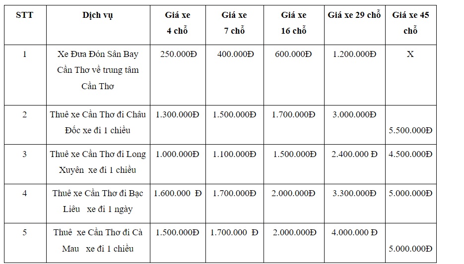 - Những giá xe trên chưa bao gồm thuế VAT và tài xế ăn ngủ theo đoàn. Bến bãi đậu đỗ xe và những điểm vào cổng tham quan du lịch thì quý khách hàng tự thanh toán.